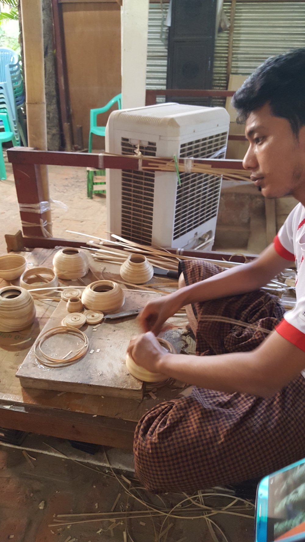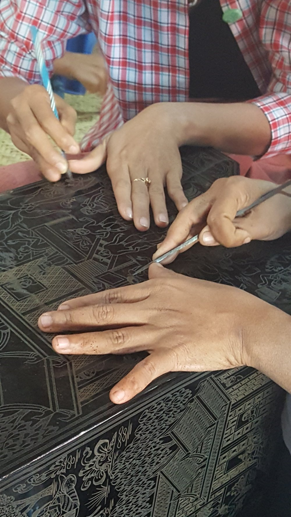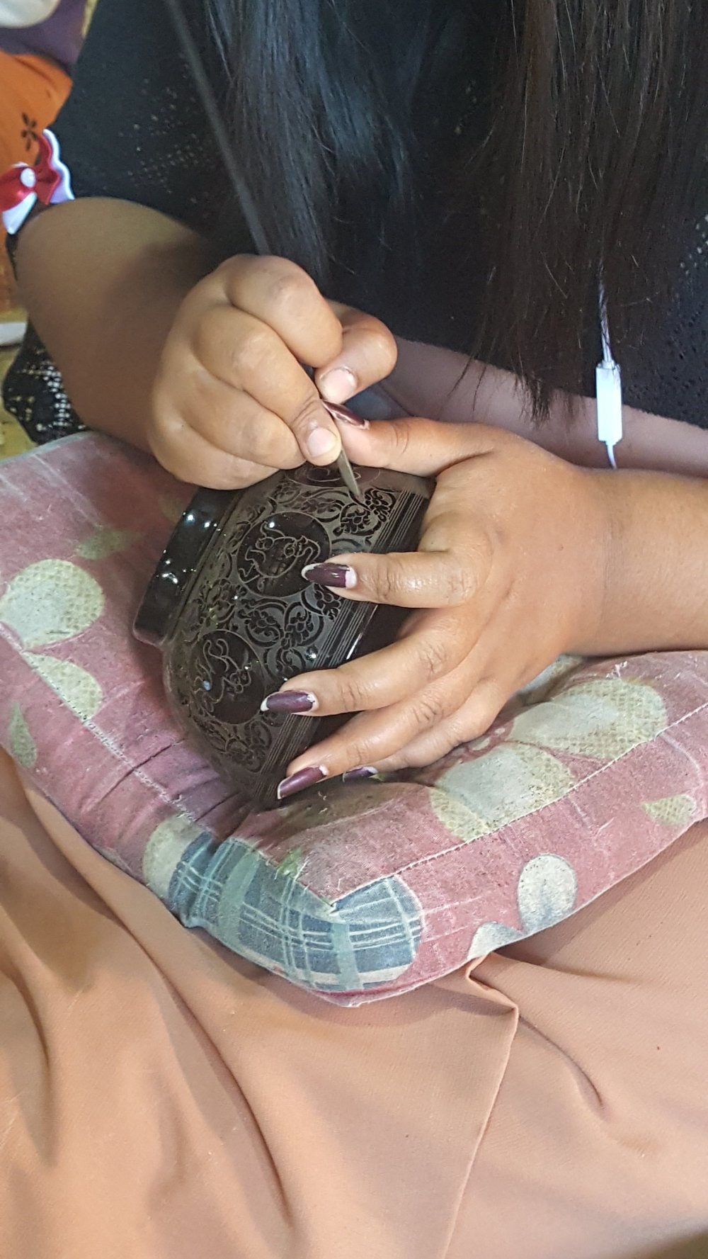 Die Gegenstände werden aus Bambusfasern geformt. Dann mit Naturharz geglättet. Graviert und wie Batik in mehreren Gängen gefärbt.