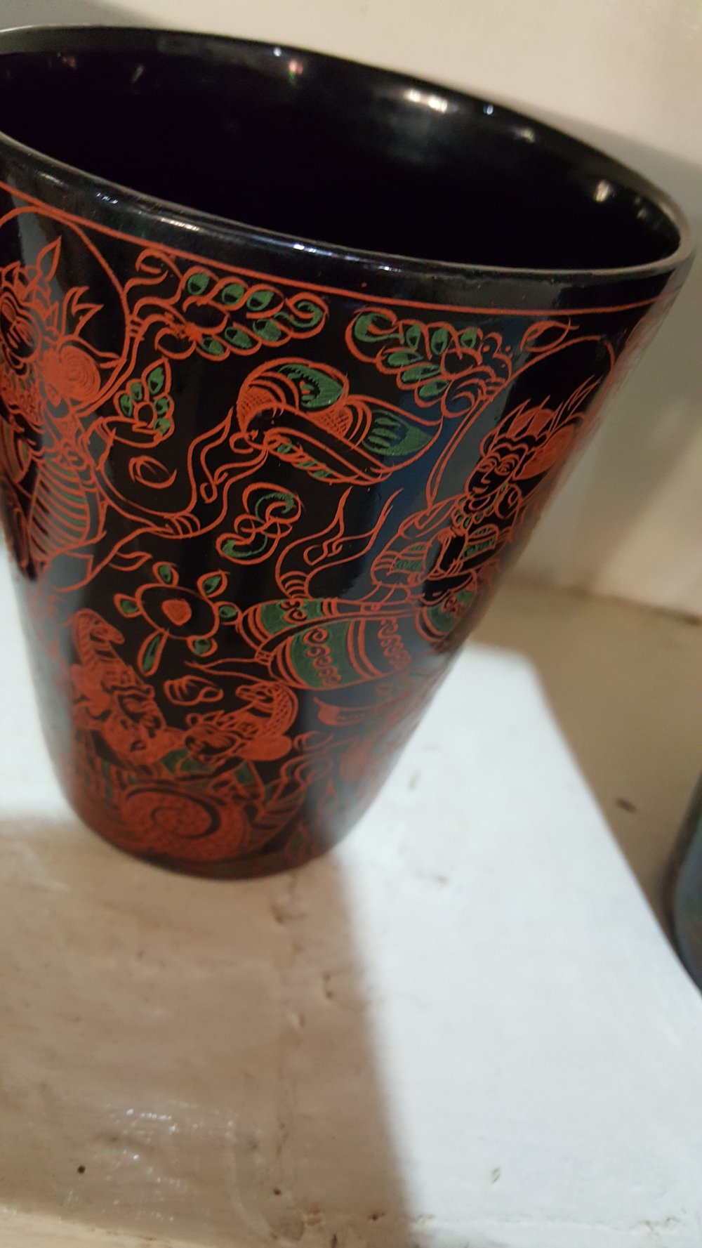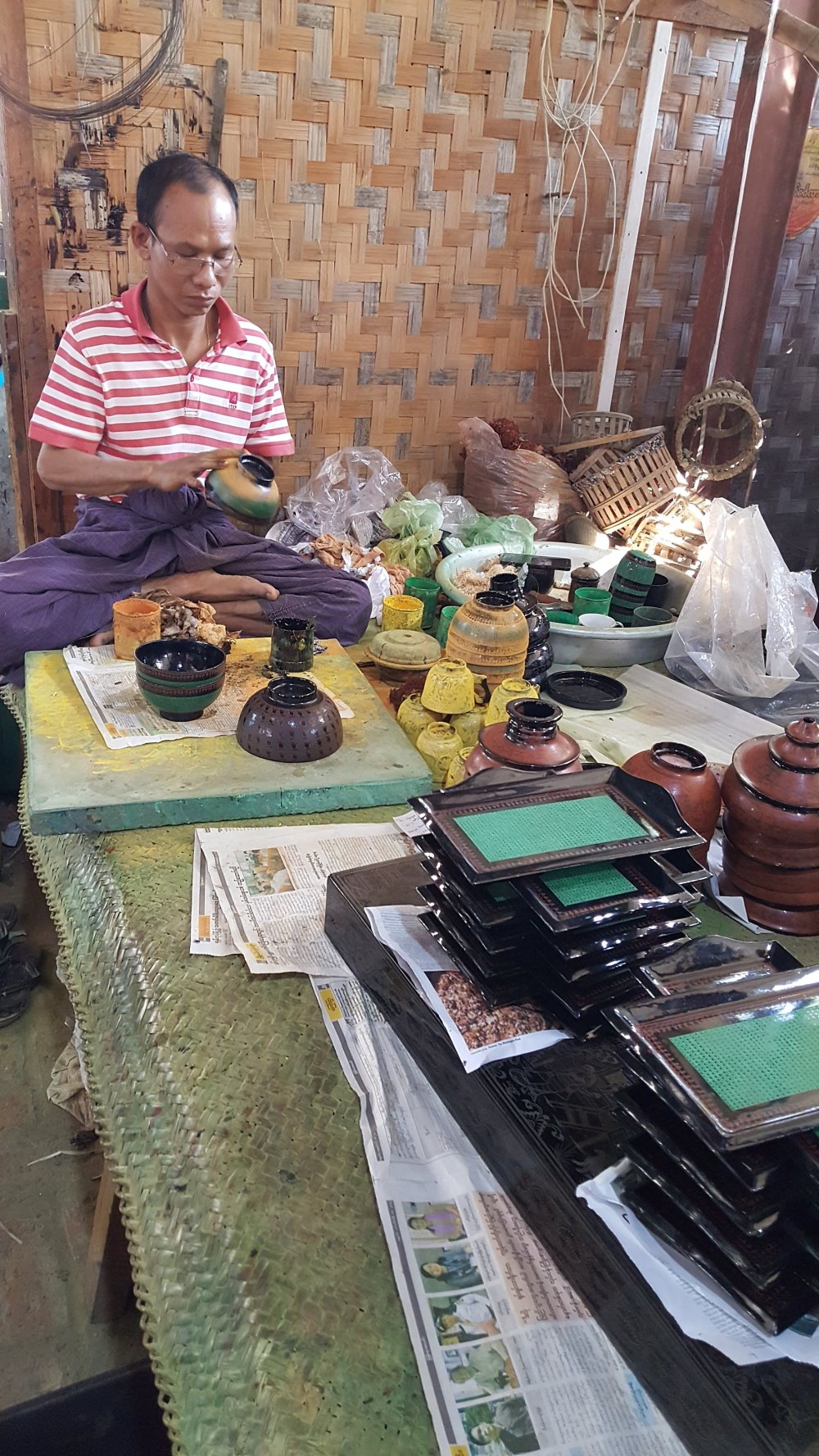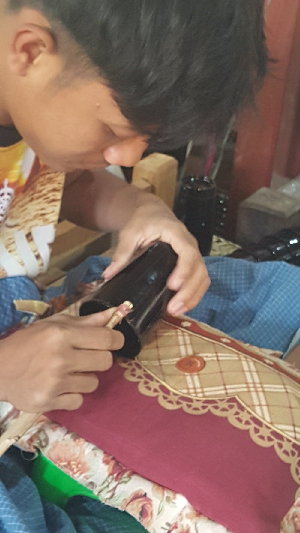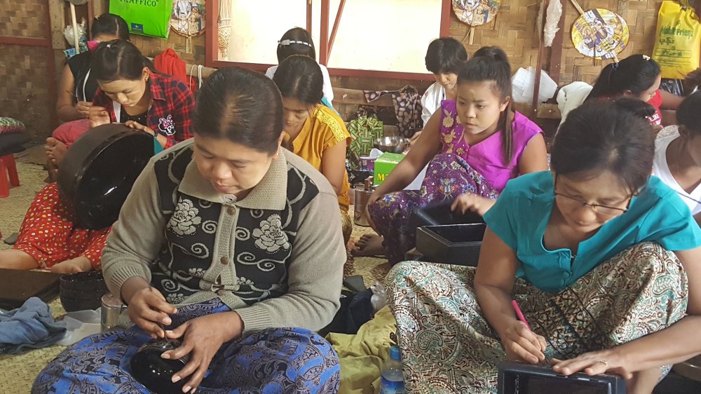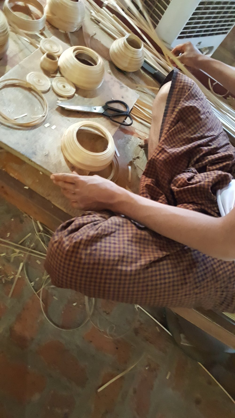 Die Gegenstände werden aus Bambusfasern geformt. Dann mit Naturharz geglättet. Graviert und wie Batik in mehreren Gängen gefärbt.